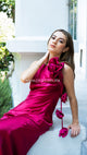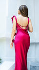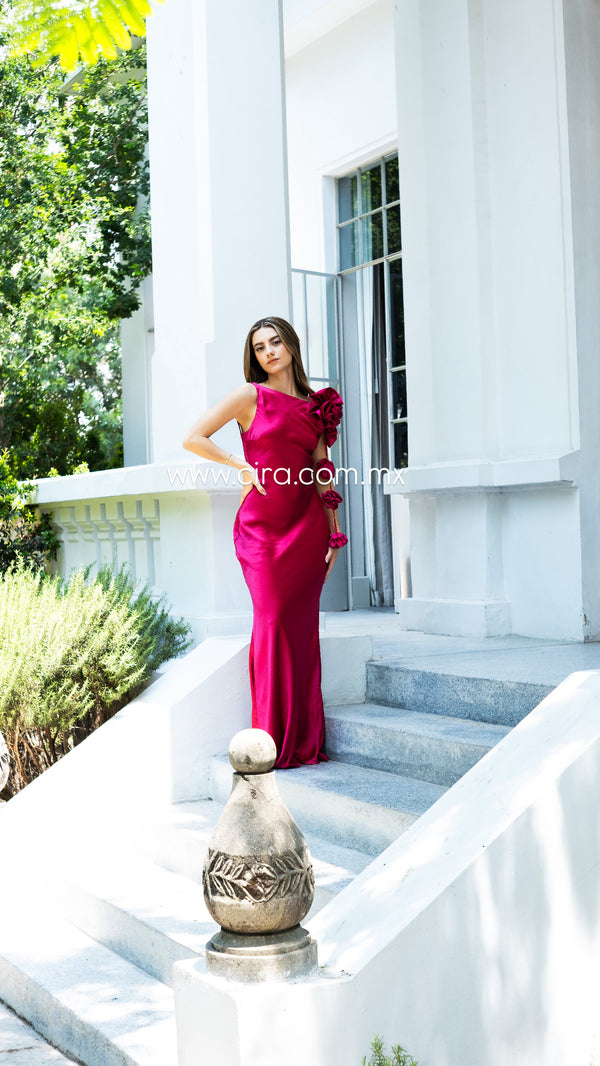 Vestido de satín en color Berry, con espalda, desnuda y un toque muy elegante de Flores en la parte lateral del hombro
