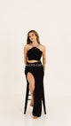 Vestido en color negro, Halter, con abertura profunda en pierna y Flor en la parte delantera