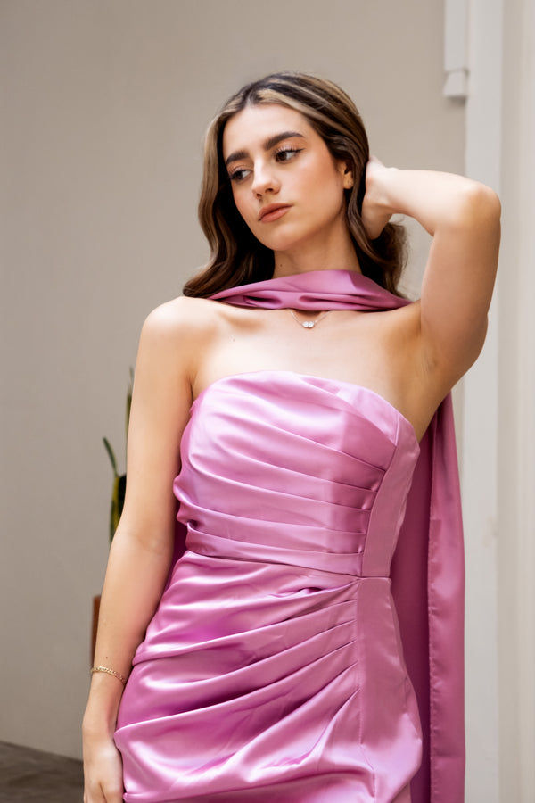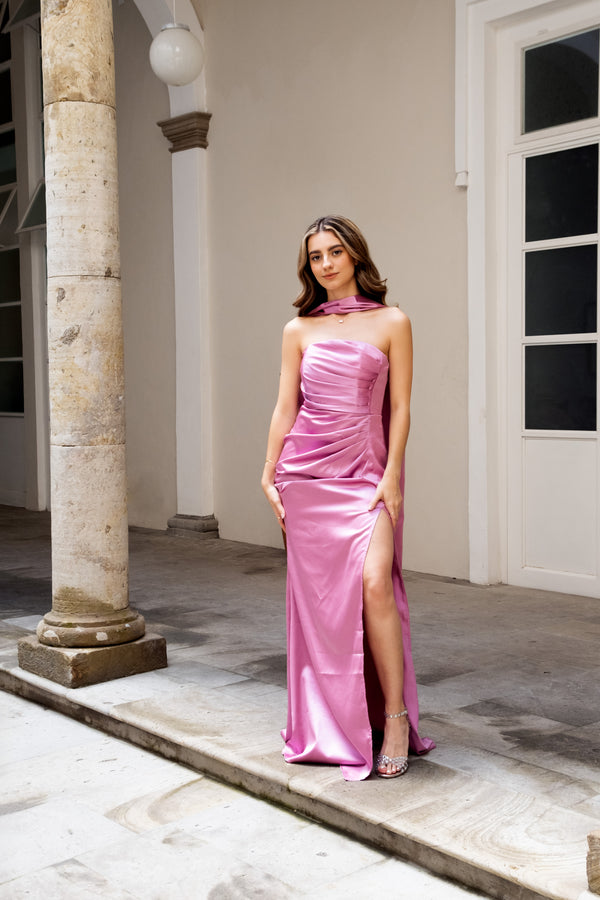 Vestido de satín en color rosa,  estraple, Con corbatín para utilizarse de diferente manera