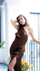 Vestido de satín en color chocolate, con abertura en pierna y Detalle en cuello