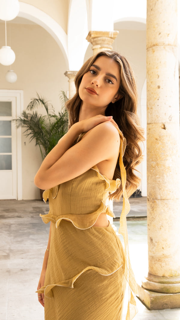 Vestido en color amarillo, doradito con un solo hombro y olancitos