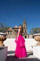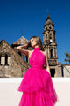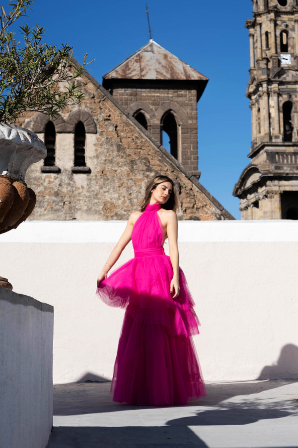 Vestido de tul en color fucsia con Halter y espalda desnuda profunda